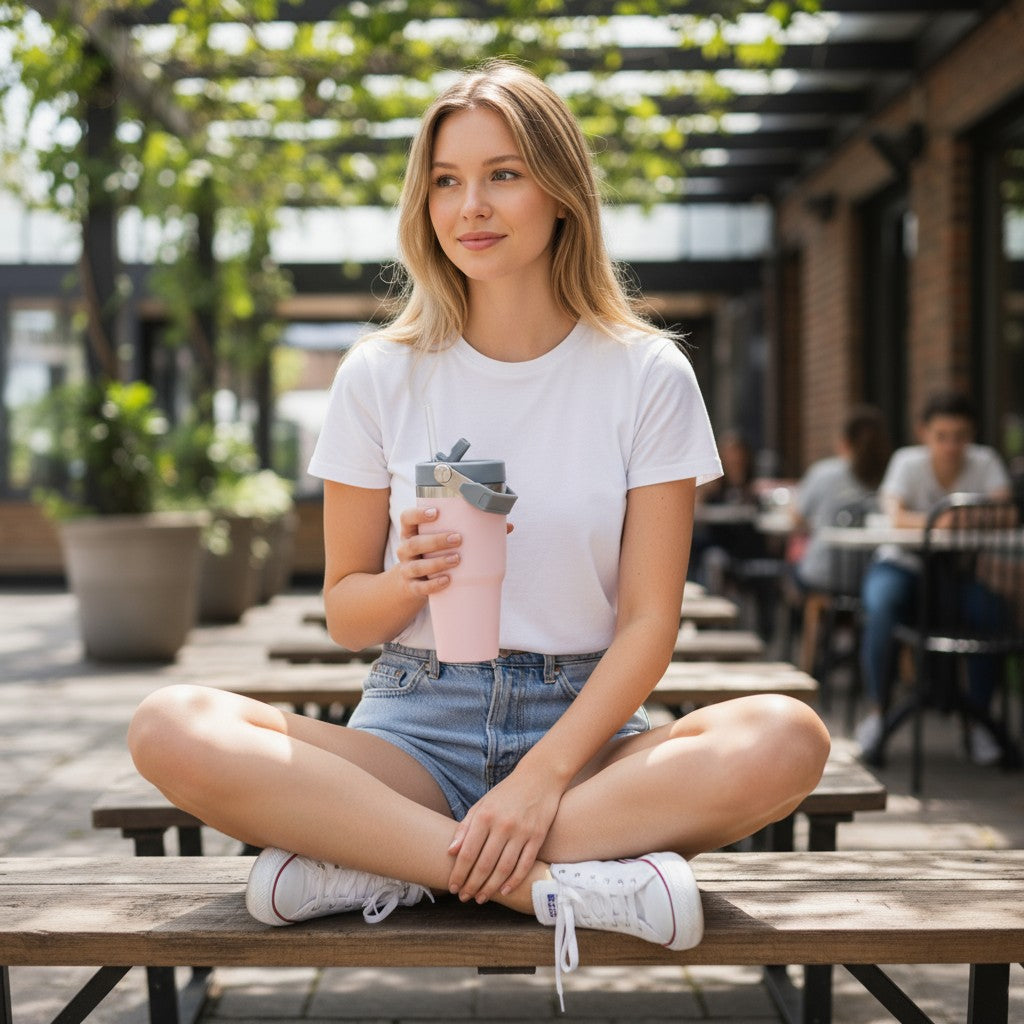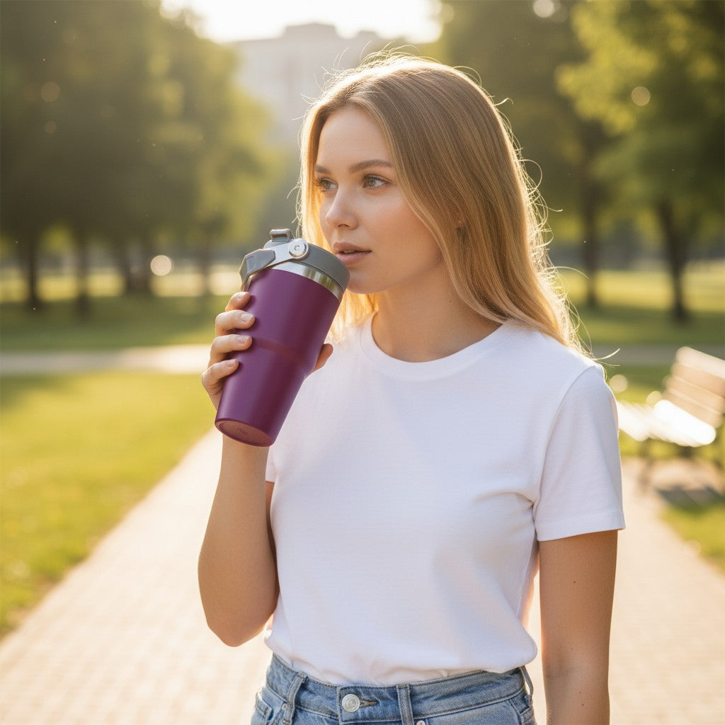 A tampa flip de vedação segura garante praticidade no uso e evita vazamentos, enquanto a alça metálica articulada proporciona conforto e firmeza para levar o copo a qualquer lugar.