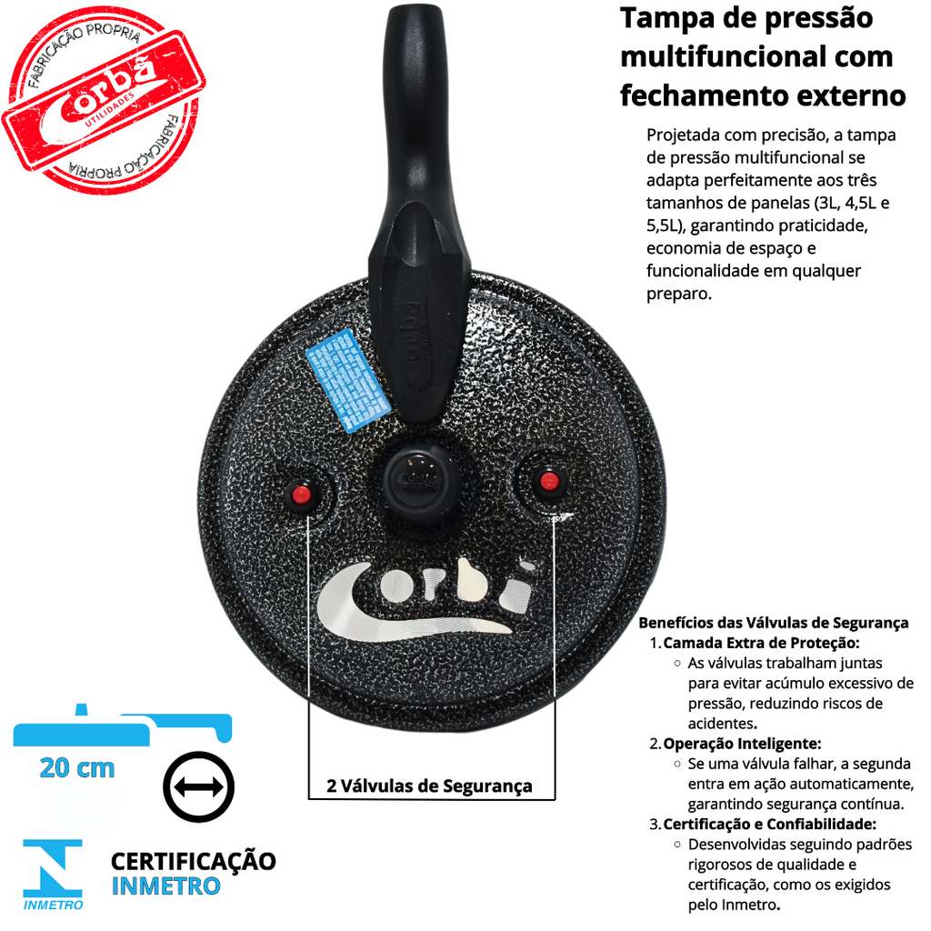 - 1 Tampa de Pressão Multifuncional com fechamento externo com duas válvulas de segurança, garantindo total confiabilidade durante o uso.