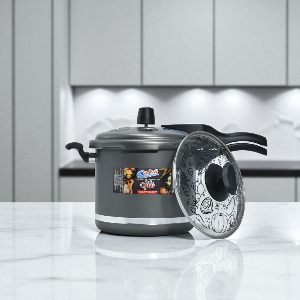 A Panela de Pressão Qatar 5,5 Litros Antiaderente Corbã é perfeita para quem precisa preparar refeições maiores com rapidez, segurança e muito mais sabor.